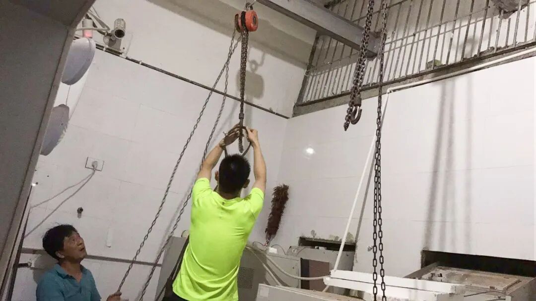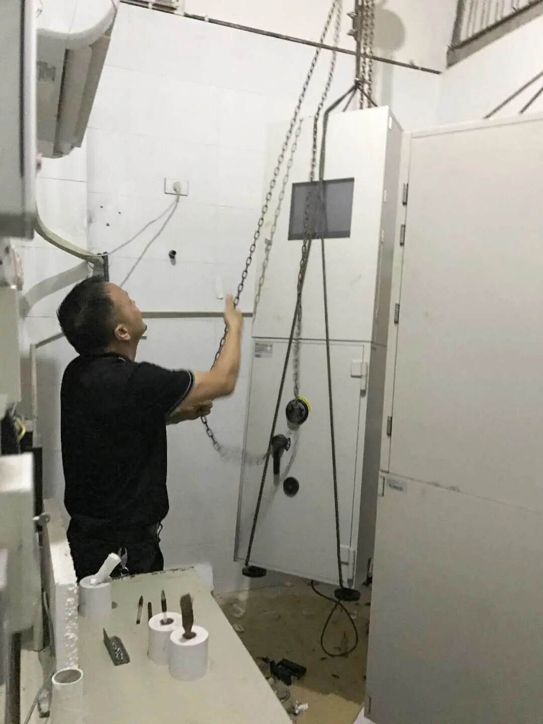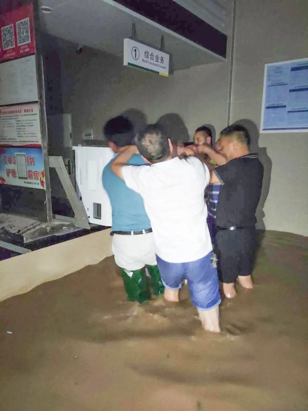 兴仁网点受灾情况比较严重,营业大厅前面街道已经形成积水,淹没两级台阶,员工立马对营业厅物品进行转移,由于ATM、CRS和ITM等设备将近千斤重,人力有限,只能用钢索先将设备吊离地面一定高度,保证设备及财产安全。
